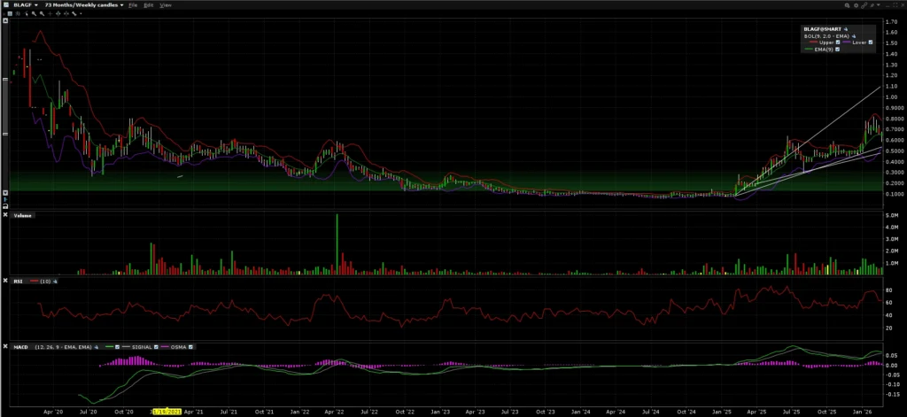 Below is a chart since 2020 of BLAGF shortly after the company was bought by Rana Vig.