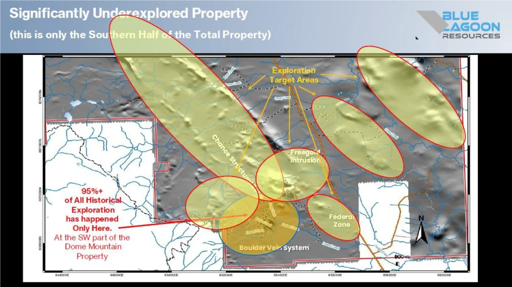 The company believes there are approximately one million ounces in the Boulder Vein System. If the infill drilling commences in August 2026, Blue Lagoon could prove 1 million ounces by year end. Using a $250/ounce valuation for gold in the ground, a $250 million incremental value add could be added to the company valuation. This Boulder Vein System is shown in the Chart below in the golden oval.