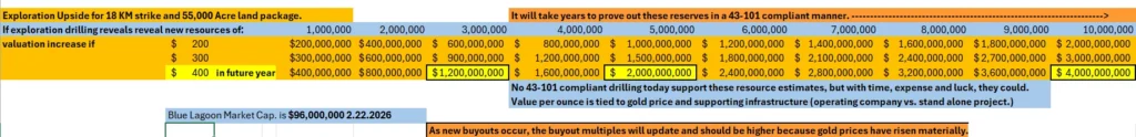 The spread sheet below reflects the potential valuation upside should drilling results suggest there are millions of ounces of gold to be discovered at Blue Lagoon.